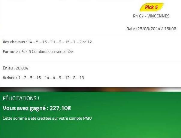 Pick 5 à 454,20 € toucher à 50 % soit 227,10 € de gains